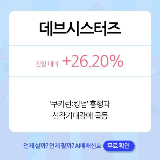 'SBS 신년특집 세기의 대결 AI vs 인간' 주식 투자 대결 부문에 대한민국 대표 주식 AI로 출연하여 주목받고 있는 라씨 매매비서가 오늘 분석한 급등종목은 데브시스터즈(+26.20%), 네오오토(+25.25%), 에스트래픽(+22.53%), 깨끗한나라(+22.21%), 중앙백신(+7.39%) 이었다.