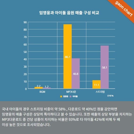 가온차트의 김진우 수석연구위원은 이와 관련해 "스트리밍 차트에서 111위를 기록고도 디지털종합차트에서 1위를 차지할 수 있었던 것은 다운로드 상품에 매출이 집중됐기 때문"이라며 "매출 구성을 살펴보면 MP3 다운 87%, 스트리밍 11%, BGM 2%로 음원 다운로드가 압도적으로 많다"고 설명했다.