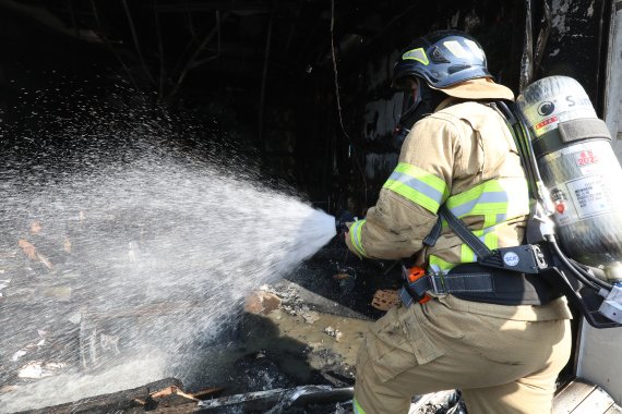소방관이 공장에서 발생한 화재를 진압하고 있다. 뉴스1