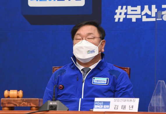 5일 오전 더불어민주당 김태년 당대표 직무대행이 국회에서 열린 중앙선대위 회의에서 눈을 감고 참석자들의 발언을 듣고 있다. 사진=공동취재단