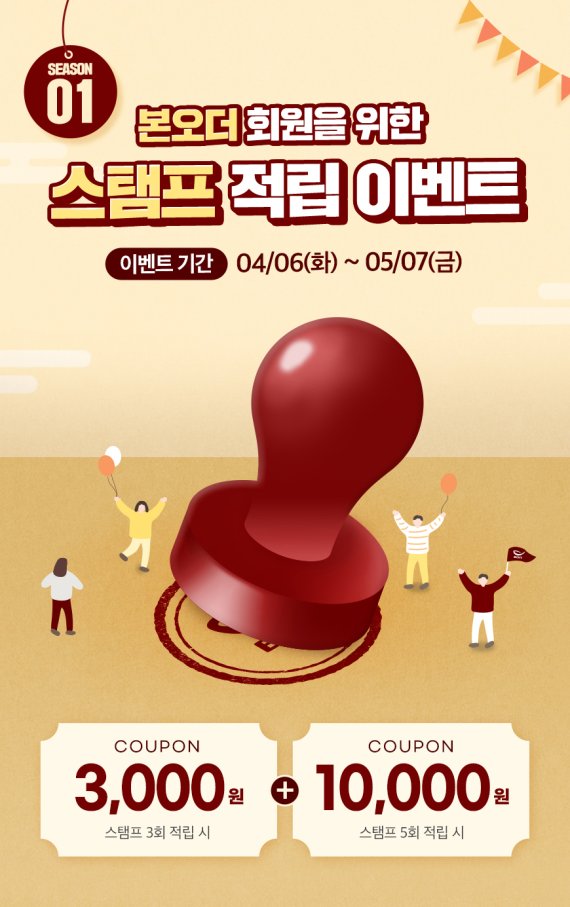 본오더 회원이라면 누구나 참여 가능하며, 해당 기간 내에 본오더를 통해 배달비를 제외하고 1만원 이상 주문 시, 스탬프가 자동 적립된다. 스탬프가 3회 적립되면 3000원 쿠폰이 발행된다. 5회 적립될 경우에는 1만 원 쿠폰이 발행돼 최대 1만3000원의 할인 혜택을 받을 수 있다.