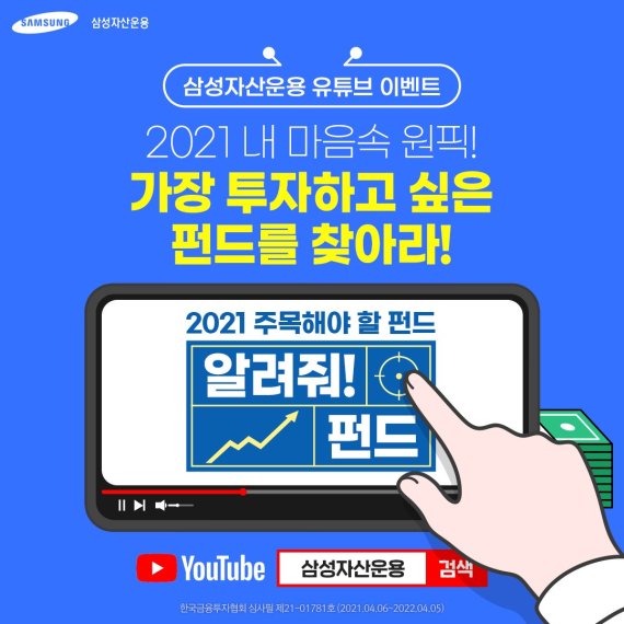 [파이낸셜뉴스] 삼성자산운용은 7일, 자사 유튜브를 통해 ‘2021 내 마음속 원픽 펀드’ 이벤트를 실시한다고 밝혔다.