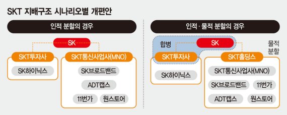 최근에는 인적·물적분할을 모두 할 것이라는 분석도 나온다. SKT를 SK하이닉스 지분을 보유한 투자회사와 그 외 부문을 보유한 SKT홀딩스(중간지주사)로 인적분할한 뒤, SKT홀딩스에서 SKT사업(MNO)을 물적분할해 지분 100%를 가진 자회사를 하나 추가로 만드는 시나리오다.