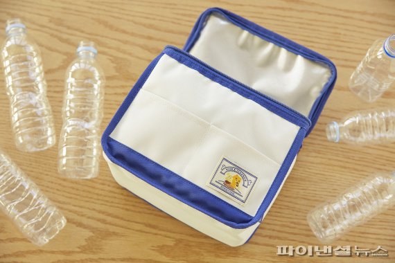 플라스틱 폐기물을 줄이기 위해 500mL 페트병 3.3개로 보냉백 1개를 만들고 제품을 친환경 비닐로 포장한다.