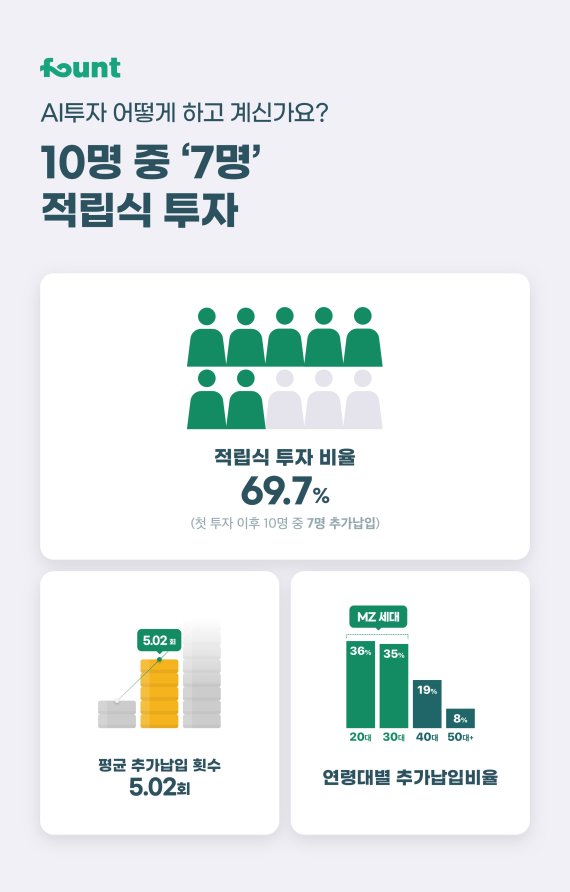 인공지능 투자 전문기업 파운트는 자사 앱 이용자들의 투자패턴을 분석해본 결과, 투자자 69.7%가 적립식 투자를 진행중이라고 밝혔다.