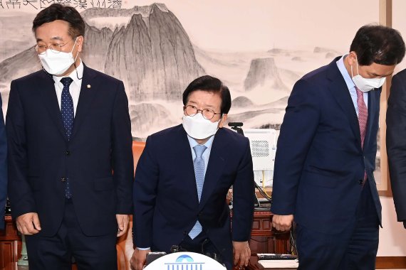 윤호중 더불어민주당 원내대표와 김기현 국민의힘 당 대표 권한대항 겸 원내대표가 13일 서울 여의도 국회에서 박병석 국회의장 주재로 의장실에서 만나 기념촬영을 마친 뒤 자리로 돌아가고 있다. 사진=뉴스1
