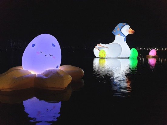 지난 15일 낙동강에 뜬 이들 대형 오리는 길이 19.5m, 높이 16.2m 크기이며, 다른 오리알 4개도 함께 있다. 야간에도 구경할 수 있도록 경관조명을 갖춘 채 24시간 시민들을 맞이한다.