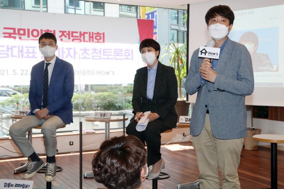 국민의힘 당 대표에 도전하는 이준석 전 최고위원이 지난 22일 오후 서울 영등포구 여의도 정치카페 하우스에서 열린 '당대표 출마자 초청 토론회'에서 인사말을 하고 있다. 왼쪽부터 김웅, 김은혜 국민의힘 의원, 이 전 최고위원. 사진=뉴스1화상