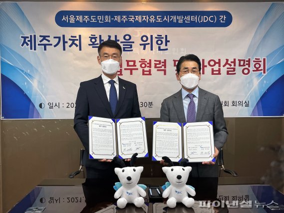 [제주=좌승훈 기자] 제주국제자유도시개발센터(JDC)은 서울제주도민회와 26일 서울 강서구 도민회 회의실에서 제주가치 확산을 위한 업무협약식을 가졌다.