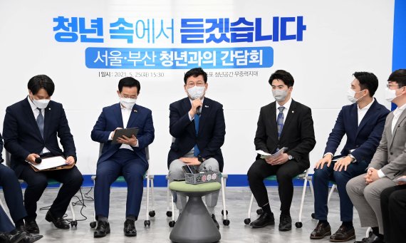 송영길 더불어민주당 대표(왼쪽 세 번째)가 지난 5월25일 서울 영등포구 무중력지대 영등포에서 열린 국민소통·민심경청 프로젝트 '서울·부산 청년과의 간담회'에서 발언하고 있다. 사진=공동취재단