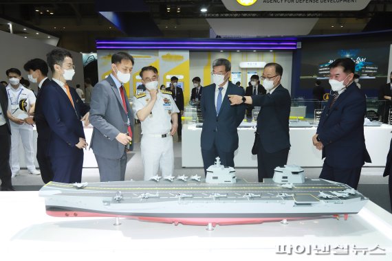 9일 부산 벡스코에서 열린 국제해양방위산업전(MADEX 2021)에서 현대중공업 부스를 찾은 한국조선해양 가삼현 사장(오른쪽 세 번째)이 해군 관계자 및 내빈들과 한국형 경항공모함(CVX) 모형을 들여다 보고 있다. /사진=현대중공업 제공