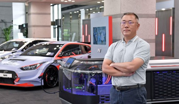 정의선 현대자동차그룹 회장이 8일(현지시간) 영국 자동차 전문지 '오토카'가 주관하는 2021 오토카 어워즈에서 최고 상인 '이시고니스 트로피'를 수상했다. 정 회장이 서울 양재동 본사 사옥에 설치된 현대차 고성능 브랜드 N 전시물 앞에서 기념촬영을 하고 있다. 현대차그룹 제공