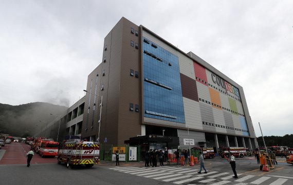 17일 오전 경기도 이천 쿠팡 덕평물류센터에서 화재가 발생해 소방대원들이 화재진압을 하고 있다.