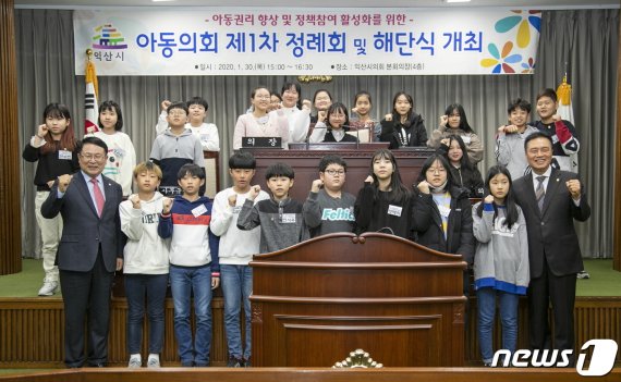 지난해 1월 전북 익산 제1대 아동의회 해단식이 열린 가운데 정헌율 익산시장과 조규대 시의회 의장이 아동의원들과 기념촬영 하는 모습. /사진=뉴스1