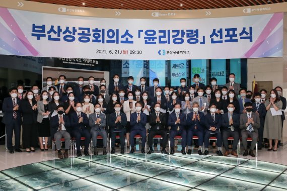 지역경제계를 대표하는 부산상공회의소가 21일 장인화 회장 취임 100일을 기념해 윤리강령 선포식을 갖고 있다. 부산상공회의소 제공