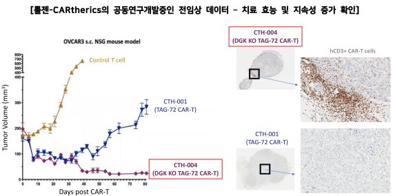 툴젠과 카세리스가 공동연구한 TAG-72 CAR-T의 난소암 전임상 동물 모델에서의 치료효능 및 지속성 증가(왼쪽 그래프) 및 CAR-T의 암 침투 증가 (오른쪽 사진)
