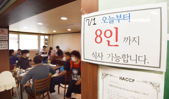 완화된 사회적 거리두기가 시행된 1일 대구 중구의 한 음식점에 '오늘부터 8인까지 식사 가능합니다'라고 쓴 안내문이 붙어 있다. 뉴시스