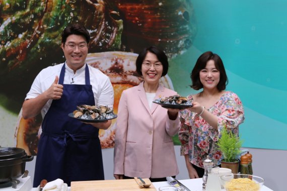 임혜숙 과학기술정보통신부 장관(가운데)이 8일 LG헬로비전 상암동 스튜디오에서 대한민국 동행세일의 일환으로 진행된 지역채널 커머스 방송을 통해 완도 전복을 판매했다. LG헬로비전 제공