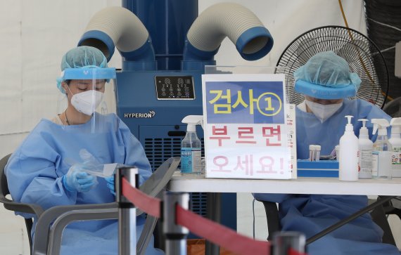 무더위가 계속되는 18일 오전 서울 노원구청 코로나19 임시선별검사소에서 겹겹의 방호복과 장갑을 착용한 의료진이 선풍기로 더위를 식히고 있다. 뉴시스