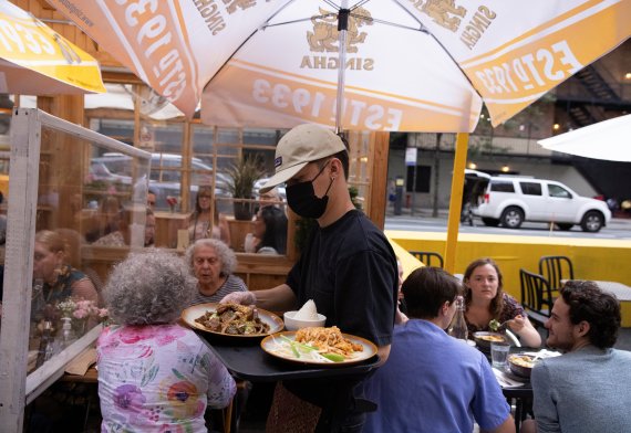 지난 3일(현지시간) 미국 뉴욕 맨해튼의 한 식당에서 점원이 마스크를 쓴 채 음식을 나르고 있다.로이터뉴스1