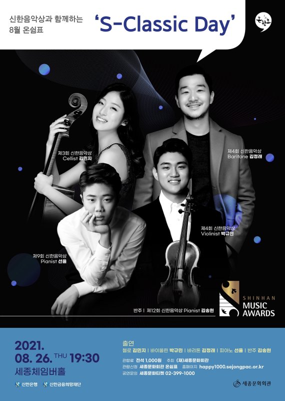 이번 공연에는 김민지(첼로, 신한음악상 3회 수상), 박규민(바이올린, 신한음악상 3회), 김정래(성악, 신한음악상 4회), 선율(피아노, 신한음악상 9회), 김송현(피아노, 신한음악상 12회)가 참여한다. 'S-Classic Day' 공연 좌석은 이날부터 세종문화회관 홈페이지에서 신청할 수 있으며 선정된 신청자는 1000원의 부담없는 가격으로 최고의 클래식 영재들의 펼치는 공연을 관람할 수 있다.