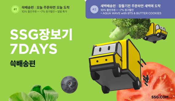SSG닷컴은 19일부터 25일까지 일주일 간 ‘쓱장보기 7DAYS(세븐데이즈)’ 행사를 진행한다고 밝혔다. 쓱배송 및 새벽배송 상품에 적용 가능한 할인쿠폰을 발급하고 특가 상품을 제안한다.