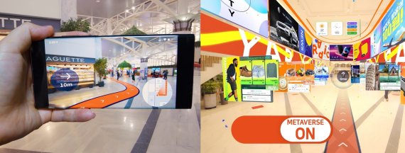 인도어 네비게이션(왼쪽)과 메타버스 서비스 기능을 설명한 이그잭스(얍엑스) 홍보 영상 이미지 컷. 사진=이그잭스