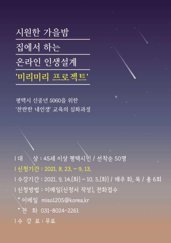 '미리미리 프로젝트'는 평택시 거주 45세 이상을 위한 인생 재설계 프로그램으로, 비대면으로 교육한다.