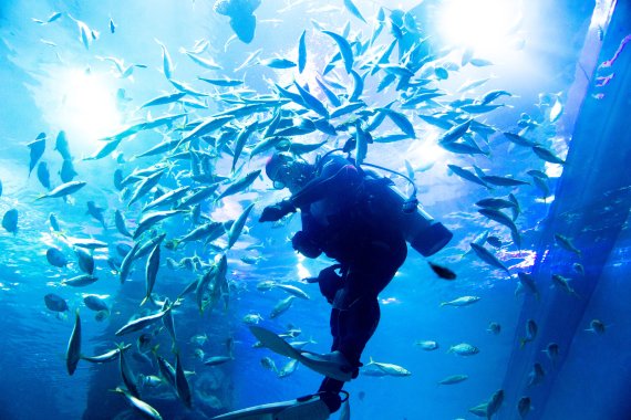 메인수조에서 해양생물들에게 먹이주는 아쿠아리스트 /사진=롯데월드