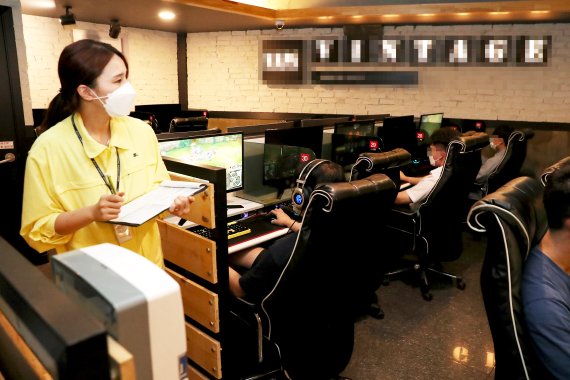 지난 24일 성동구 및 문화체육관광부 직원들이 성동구 관내 학교 주변 PC방을 방문해 방역수칙 준수 여부에 대한 합동 현장 점검에 나서 출입자들의 올바른 마스크 착용 여부를 확인하고 있다. 뉴시스 제공.