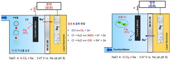 해수전지를 충전하면 바닷물의 소금(NaCl) 성분 중 나트륨 이온(Na⁺)이 이동하며 염소가 생성되는데, 이 염소가 살균 물질로 작용해 박테리아나 병원균을 제거한다. 반대로 방전될 때는 살균 물질이 나트륨 이온을 만나 중화되면서 다시 소금으로 변한다.