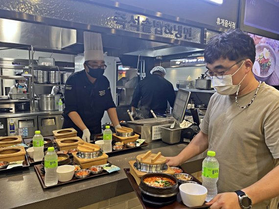 양평휴게소 몽글순두부솥밥에서 고객이 몽글몽글순두부찌개를 전달받고 있다. (사진=풀무원푸드앤컬처)