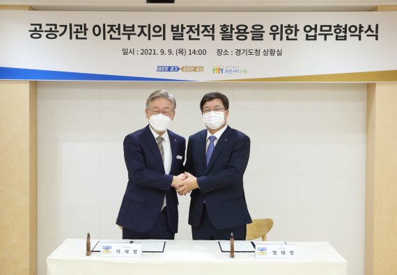 이재명 경기도지사는 9일 경기도청에서 염태영 수원시장과 함께 '공공기관 이전부지의 발전적 활용방안 모색 위한 업무협약'을 체결했다.