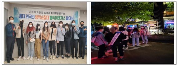 서울 마포경찰서는 홍익대 주변 외국인들의 방역수칙 위반에 대한 특별순찰을 위해 '홍익 어벤져스'를 구성했다고 8일 밝혔다. 8개국 9명의 유학생이 참여한 홍익어벤져스가 특별순찰에 나선 모습(오른쪽). 사진=서울 마포경찰서