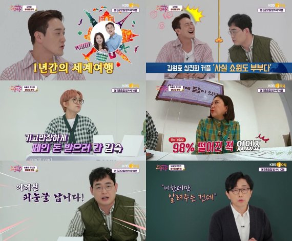 '국민 영수증'이 김원효의 영수증을 탈탈 털어버렸다.지난 8일 방송된 KBS Joy 예능 프로그램 '국민 영수증' 5회에서는 개그맨 김원효의 영수증을 들여다보는 3MC 송은이, 김숙, 박영진의 모습이 전파를 탔다.이날 김원효는 "코로나19가 종료되면 하던 일을 멈추고 아내 심진화와 1년 동안 세계여행을 가고 싶다"라고 영수증을 공개한 이유를 밝혔다. 하지만 이를 들은 박영진은 "항간에 쇼윈도 부부설이 돌더라"며 돌직구를 날렸고, 김원효는 "심진화가 워낙 사진 찍는 걸 좋아해서 그런 오해가 생긴 것 같다"고 해명하며 쇼윈도 부부설을 일축했다.곧이어 공개된 김원효의 영수증에는 패션 아이템 구매 목록이 가득해 눈길을 끌었다. 특히 마음에 드는 옷은 색깔별로 구매한 흔적이 있어 "'사장님 미쳤어요?'라는 세일 문구는 사실 '우리가 미쳤다'는 뜻이다"라는 박영진의 깔깔이 조언을 이끌어냈다.김원효의 영수증에 심진화를 위한 결제는 정수기 렌털 자동이체 뿐이었고, 3MC는 "사랑꾼 이미지가 센데 아내를 위한 소비가 이것밖에 없다", "그래서 쇼윈도 부부설이 나오는 거다"라고 공격했다. 이에 당황한 김원효는 "(결제 내역을) 몇 개 지운 거 아닌가? 영수증 때문에 이혼하면 진짜 웃기겠다"라고 너스레를 떨어 웃음을 안겼다.이후 이날의 주인공인 의뢰인의 영수증이 베일을 벗었다. 의뢰인은 빚을 갚기 위해 고군분투 중인 투잡러로, 어려운 가정 형편 속에서 동생들을 건사하기 위해 빚이 생겼다고 이야기해 박수를 받았다. 또 그는 사촌동생의 부탁으로 대출을 받아 돈을 빌려줬지만 돌려받지 못했다고 덧붙여 안타까움을 자아냈다. 이때 송은이가 "저도 돈을 빌려준 지 1년이 되도록 소식이 없어서 김숙한테 말했더니 떼인 돈을 받아다 줬다. 그때의 김숙이 내 인생에서 제일 멋졌다"라고 털어놔 시선을 모으기도.이 외에도 의뢰인은 주변의 말만 듣고 주식 투자를 했지만 -33%의 손해를 봤다고 고백했고, 김숙 역시 "저는 상장폐지로 -98%까지 떨어진 적도 있다. 주식을 사고 나면 옆 사람이 다 바보로 보인다"라며 과거 자신의 실패담을 회상했다. 끝으로 의뢰인은 주변을 위한 거침없는 씀씀이와 88만원짜리 청소기, 250만원짜리 텔레비전, 수많은 OTT 결제 내역 등으로 충격을 안겼고, 박영진은 "이 정도면 OTT가 아니라 PTT다. 피눈물 난다"라며 과소비를 줄일 것을 당부했다.