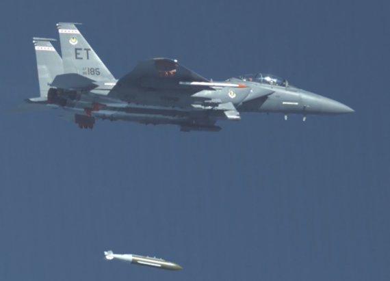 미국 플로리다주에 있는 에글린 공군기지는 지난 7일 F-15E 전투기가 3만5천ft 상공에서 GBU-72 첨단 A5K 관통탄을 투하했다고 밝혔다. 사진=미 공군 제공
