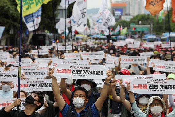 전국민주노동조합총연맹(민주노총) 조합원들이 7월 3일 오후 서울 종로3가 거리에서 가진 전국노동자대회에서 구호를 외치고 있다. /사진=뉴스1