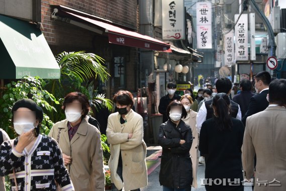 단계적 일상회복(위드 코로나)가 시행된 1일 서울의 한 식당가가 시민들로 붐비고 있다. 사진=서동일 기자