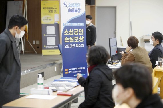 [광주=뉴시스] 변재훈 기자 = 광주 북구청 민생경제과 자영업지원센터 직원들이 소상공인의 날을 하루 앞둔 4일 오전 광주 북구청 지하 민방위교육실에서 소상공인 손실보상금 신청을 돕고 있다. (사진=광주 북구 제공) 2021.11.04. photo@newsis.com *재판매 및 DB 금지 <저작권자ⓒ 공감언론 뉴시스통신사. 무단전재-재배포 금지.> /사진=뉴시스화상