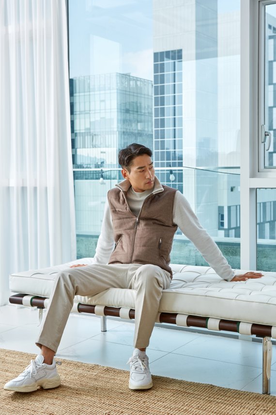 인터뷰와 함께한 화보와 영상에서 김정환 선수는 캐시미어 혼방 소재의 베이지색 베스트 점퍼와 광택감이 돋보이는 구스 다운을 포인트로 활용해 부드러우면서도 세련된 캐주얼룩을 연출했다.