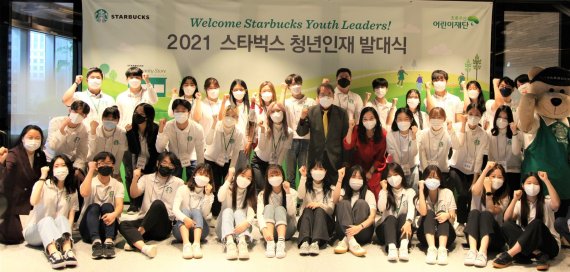 스타벅스커피 코리아는 커뮤니티 스토어를 통해 후원하는 청년인재 7기 대학생 10명을 새로 선발했다고 10일 밝혔다. 스타벅스 커뮤니티 스토어 청년인재 7기 발대식에서 청년인재들이 스타벅스 인사담당 장수아 상무(가운데 줄 오른쪽에서 여섯 번째), 초록우산 어린이재단 이제훈 회장(가운데 줄 오른쪽에서 일곱 번째)과 기념 사진을 찍고 있다. / 사진=스타벅스 코리아 제공