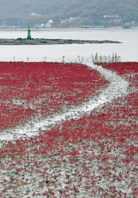 늦가을 석모도 갯벌을 물들인 붉은 물결, 칠면초입니다.
