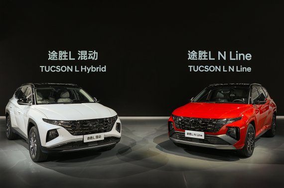 현대차가 '2021 광저우 국제모터쇼'에서 선보인 중국형 투싼 하이브리드와 중국형 투싼 N라인. 현대차 제공
