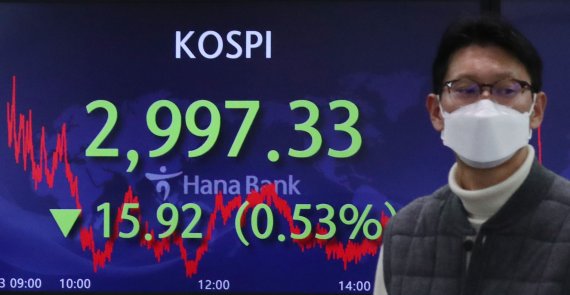 코스피가 전 거래일(3013.25)보다 15.92포인트(0.53%) 내린 2997.33에 장을 마감한 23일 오후 서울 중구 하나은행 딜링룸 전광판에 지수가 표시되고 있다. 사진=뉴시스