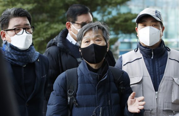 전태일 열사 동생 전태삼씨가 계엄포고 위반 혐의로 처벌받은 어머니 故 이소선 여사 재심사건 공판을 위해 25일 서울 도봉구 서울북부지방법원으로 들어서며 간단한 입장을 밝히고 있다. /사진=뉴스1