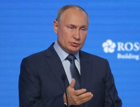 블라디미르 푸틴 러시아 대통령이 지난 10월 13일 러시아 모스크바에서 열린 러시아 에너지주간 국제포럼 전체회의에서 연설하고 있다. 로이터뉴스1