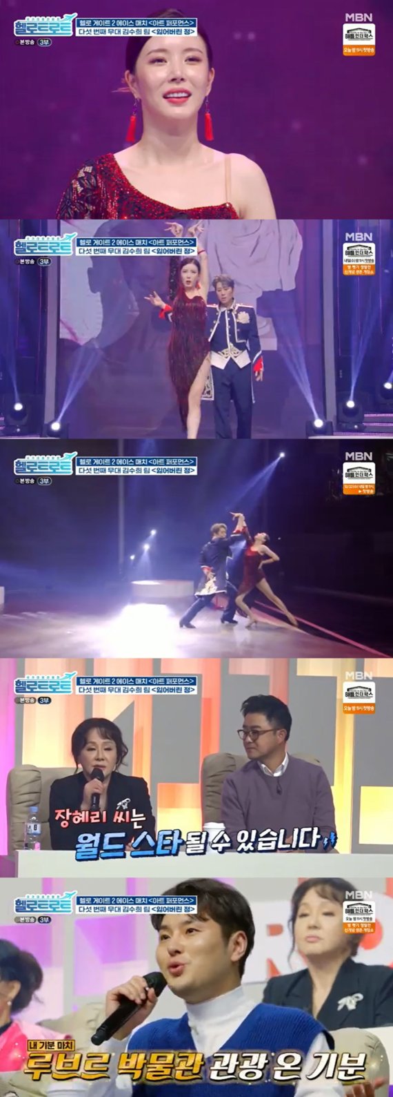 걸스데이 출신 장혜리가 댄스 스포츠 퍼포먼스로 '헬로트로트'를 화려하게 물들였다.장혜리는 지난 21일 밤 9시 40분 방송한 MBN 예능프로그램 '헬로트로트'에서 '헬로 게이트2' 에이스 매치 '아트 퍼포먼스' 부문에 참여했다.장혜리는 첫 등장부터 매혹적인 댄스 스포츠 의상으로 이목을 집중시켰다. 특히 김수희의 '잃어버린 정'을 편곡, 탱고 리듬에 맞춰 김민재와 완벽한 댄스 스포츠 퍼포먼스를 선보여 감탄을 자아냈다.무대가 모두 끝난 후 김수희 감독은 "장혜리는 월드 스타가 될 수 있다"는 극찬과 함께 눈시울을 붉혔다. 김경범 심사위원은 "트로트계 물건이 나타났다"며 "마치 루브르 박물관을 보는 듯한 느낌이었다"고 소감을 전했다. 부활의 김태원 또한 "댄스가 정말 좋았다"면서 장혜리를 치켜세웠다.'아트 퍼포먼스' 부문에 참여한 김수희 팀의 다른 팀원들도 장혜리를 향해 박수를 아끼지 않았다.