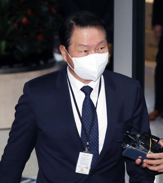 최태원 SK그룹 회장이 15일 정부세종청사에서 열린 SK실트론 사익편취 의혹 관련 공정거래위원회 전원회의에 참석하기 위해 출입문을 통과하고 있다.