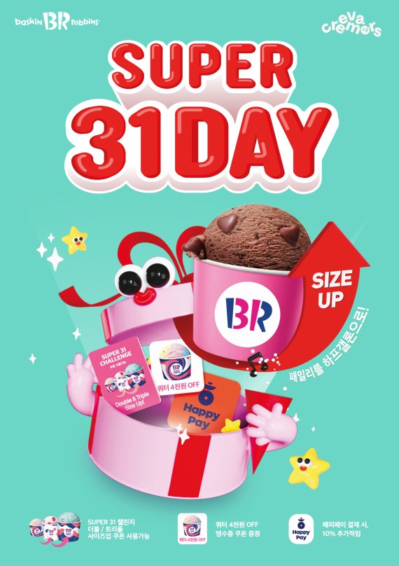 배스킨라빈스 ’슈퍼 31데이’는 31일 하루 동안 패밀리를 구매하면 6가지 맛의 하프갤론으로 업그레이드되는 것은 물론 풍부한 추가 혜택까지 제공하는 행사다. 먼저, 배스킨라빈스 오프라인 매장에서 행사에 참여한 모든 고객에게 쿼터 사이즈 4000원 쿠폰을 제공한다. 또, 간편결제 서비스 ‘해피페이’를 통해 행사 제품을 결제하면 구매 금액의 10%가 해피포인트로 추가 적립된다.