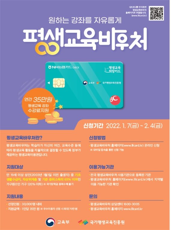 교육부와 국가평생교육진흥원은 오는 7일 오전 10시부터 다음달 4일 오후 6시까지 올해 평생교육이용권 신청을 받는다.
